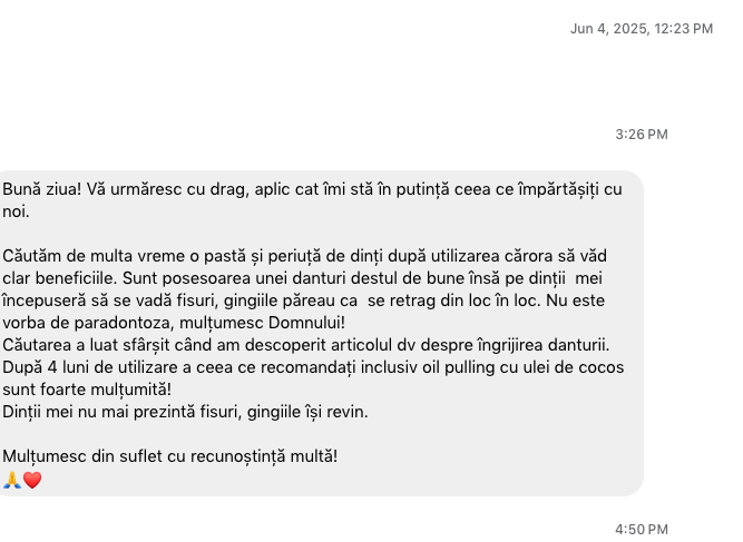 Am sa mentionez un testimonial de la un cititor al site-ului meu, facut in 2025 in care subliniaza ca sfaturile de mai jos i-au rezolvat multe probleme cu dintii. Am facut poza la testimonial, inclusiv data cand a fost facut ca sa ramana in arhiva.