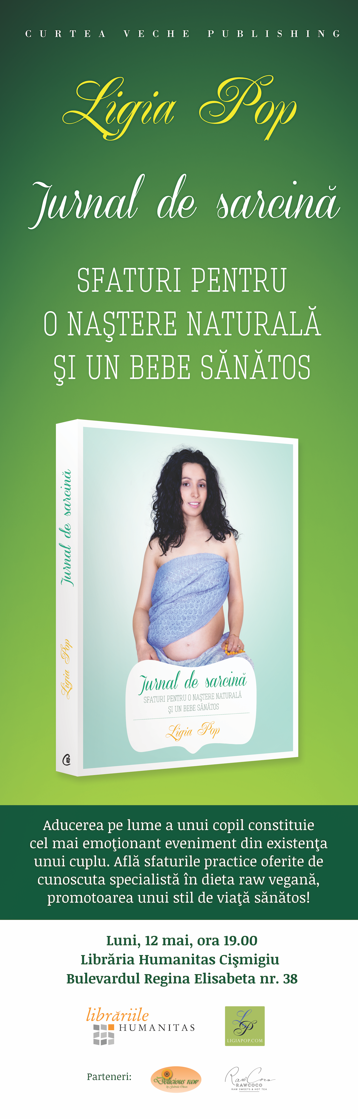 Diseara la ora 7 va invitam cu drag la Libraria Humanitas de la Cismigiu (B-dul Regina Elisabeta nr. 38, Bucuresti) pentru lansarea noii mele carti, „Jurnal de sarcina: sfaturi pentru o nastere naturala si un bebe sanatos„. Veti avea parte de gustari delicioase raw de la Delicious Raw si Rawcoco si de o discutie interesanta despre acest timp minunat din viata unei femei. Evenimentul este organizat de Curtea Veche Publishing. Ne vedem acolo!