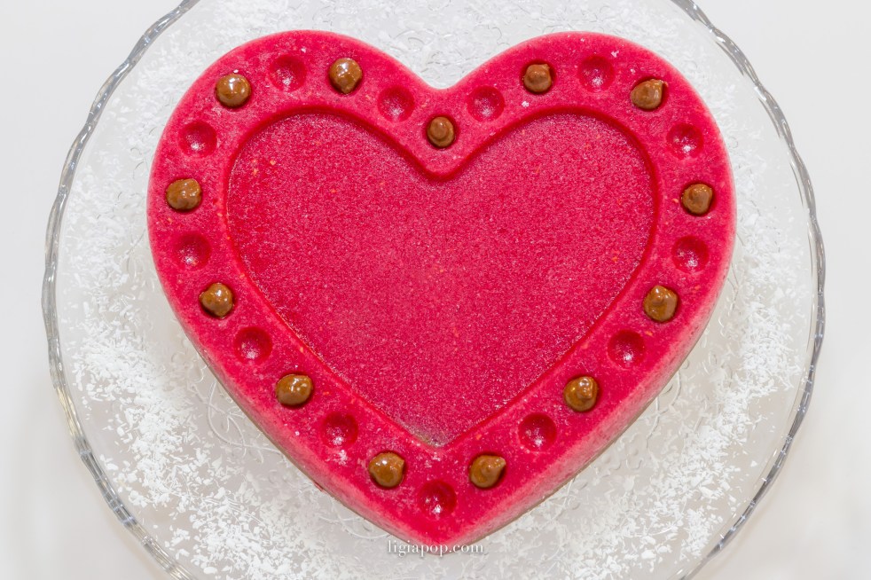 Toate ingredientele se proceseaza intr-un blender de viteza mare, impingand si ajutand blenderul sa le amestece foarte bine. La final trebuie sa arate precum un gelatto. Gustati si daca nu este suficient de dulce, mai adaugati indulcitor natural. Puneti compozitia intr-o forma de inimioara si dati-o la congelator pana se intareste complet. Nu spalati cupa, ci amestecati ingredientele pentru ciocolata de mai jos. Gustul de zmeura va da o aroma speciala cremei de ciocolata.