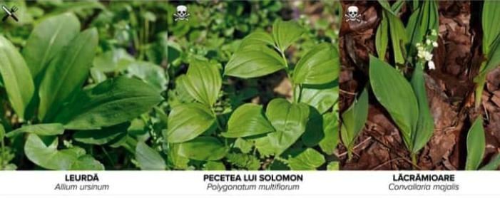 • Evitati pentru inceput plantele care pot fi confundate usor intre ele, fiindca unele sunt letale. De exemplu, frunzele de lacramioare care sunt otravitoare, pot fi confundate cu cele de leurda, care au un miros puternic de usturoi. Poza de mai jos care se refera la leurda si alte plante cu care se poate confunda, a fost gasita pe Facebook, fara sursa.