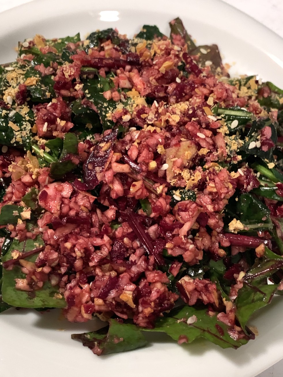 Frunzele tocate de kale se „framanta” fiindca au o textura densa, dupa care se amesteca cu toate ingredientele. Retineti ca daca nu aveti un ingredient anume, salata poate fi facuta si cu ce aveti. Important este usturoiul, zeama de lamaie sau pudra de vitamina C alcalina si multe frunze verzi sau vlastari :-). Da, m-ati auzit bine, folosesc pudra de vitamina C atunci cand nu am lamaie :-,) pe care ni-o procuram din 2010 incoace, de la Raw Vegan Mall.