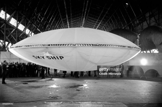 Citez: „Mr. John West and his firm John West Design Associates of Epsom, Surrey, who have worked on the project for more than two years. The 30-foot saucer took off near Bedford to notch a first for British aviation. The setting for the radio-controlled, unmanned flight was the Royal Aircraft establishment hangar at RAF Cardington fomerly the Royal Airship Works, built to house the ill-fated R101 Airship. April 1975 (Photo by WATFORD/Mirrorpix/Mirrorpix via Getty Images).”