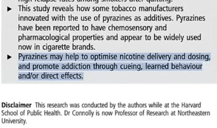 Acele substante adaugate in tigari, si in special familia de aditivi numita pirazina, care contine peste 13 categorii de compusi chimici, puse impreuna cu altele in tigarile obisnuite, sunt cele care dau dependenta majora si lipsa de control in comportament. La un punct au fost si tigari care se laudau ca aveau un strat „protectiv” de azbest, cu scopul de a filtra mai bine. Asa ceva…