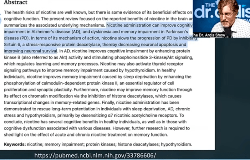 Asa cum mentioneaza Dr. Bryan Ardis si in videourile de mai jos, un studiu de la Harvard din 2014 a recunoscut ca nicotina separata de substantele care creaza dependenta din tigari, nu da dependenta, ci din contra, ajuta la sanatatea generala.