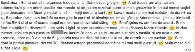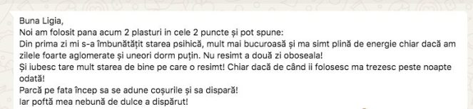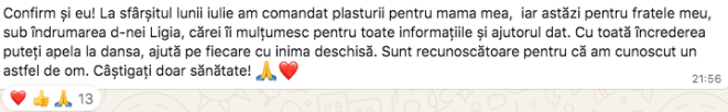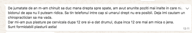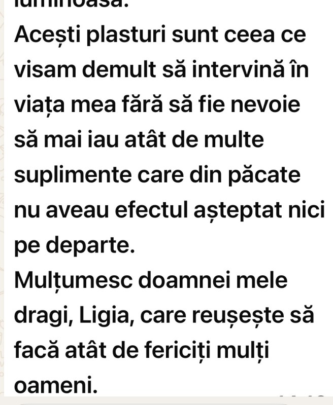 Ma puteti contacta doar in scris pe WhatsApp la +40 756 859 054. Tot acolo am un grup public dedicat testimonialelor, unde zilnic atat eu cat si cei pe care ii am in grija isi publica testimoniale, in care povestesc cum viata lor s-a schimbat radical dupa folosirea acestor plasturi. Nu scriu toti, fiindca la unii le este jena sau uita, de aceea cateodata le cer permisiunea sa le public eu mesajele care mi le trimit in privat. Toti care doriti sa fiti in acel grup, fara sa fie nevoie neaparat sa achizitionati plasturii, puteti sa imi scrieti pe WhatsApp si va adaug.
