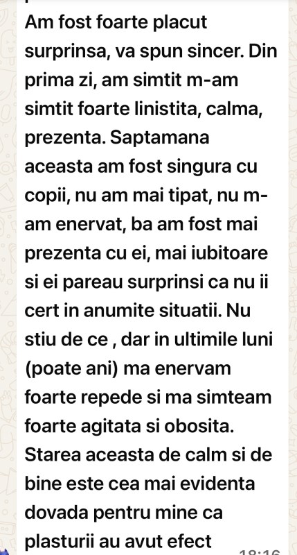 Ca sa fiu sigura ca nu sunt un caz unic, am trimis plasturii cu forta la cunostinte si rude. Multi au fost sceptici la randul lor si imi spuneau, „ce pot sa faca niste plasturi pentru starea mea, pentru epuizarea mea vesnica, pentru anxietatea mea”? Pe toti i-am rugat sa ii incerce si sa ma tina la curent. Dupa 2 luni de folosire, la toata lumea au fost rezulte neasteptate, chiar si la alte probleme mai vechi cu care se chinuiau. Am decis ca nu pot sa mai tac si ca voi incepe sa spun public de ei, ca sa ajut pe cat de multi.