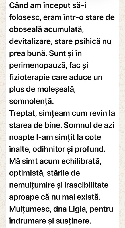 Initial am fost sceptica, insa folosindu-i, pe langa suplimentele naturale, detox-uri si deparazitari periodice, cat si toate celelalte obiceiuri de stil de viata echilibrat ce fac parte din rutina zilnica, am descoperit un alt nivel de functionare in acest cocktail de poluare in care traim: o alta energie, stare de bine si echilibru, claritate mentala, un somn calitativ intr-un timp mai scurt, gestionarea mai buna a stresului, concentrarea mai mare si realizarea intr-un timp mai scurt a obiectivelor care durau mai mult inainte, scaderea inflamatiei din corp etc.