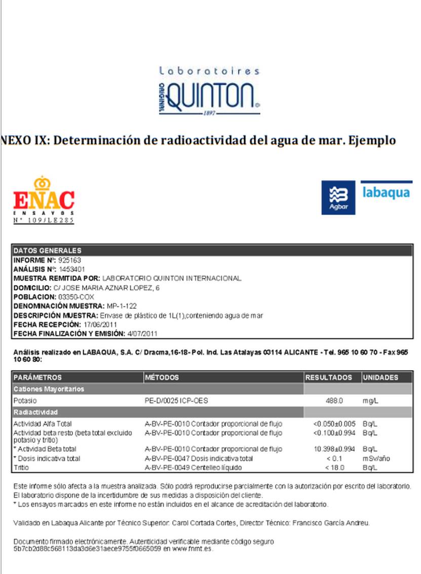Compoziție: apă marină, extrasă din ocean din zonele cu vortex de plancton, micro-filtrată la rece. Elaborata într-un mediu steril (G.M.P.), în conformitate cu protocolul original al fiziologului si biologului Rene Quinton. Ambalare în camera cu aer controlat conform clasei ISO 5, secțiunea 5.1.1, Metoda de preparare a produselor sterile conform Farmacopeei Europene, ediţia 6.